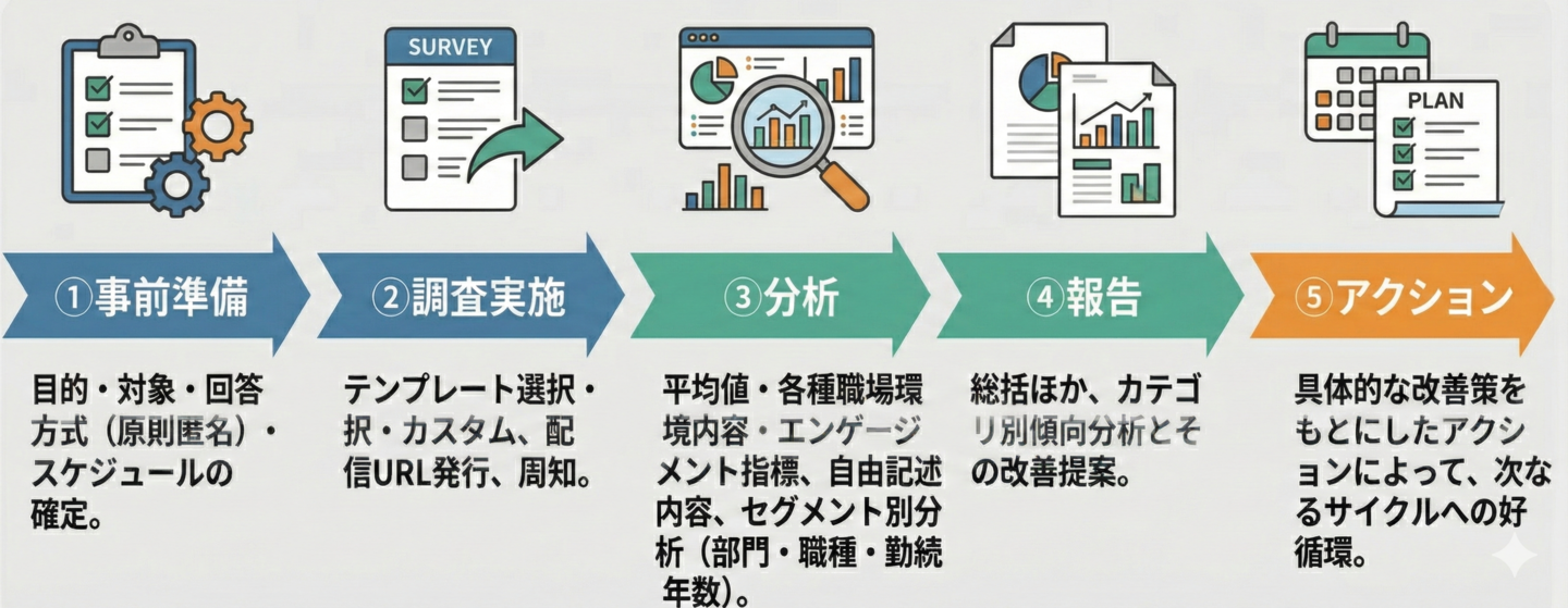 事前準備から調査実施・分析・報告・アクションまでを5ステップで体系化。