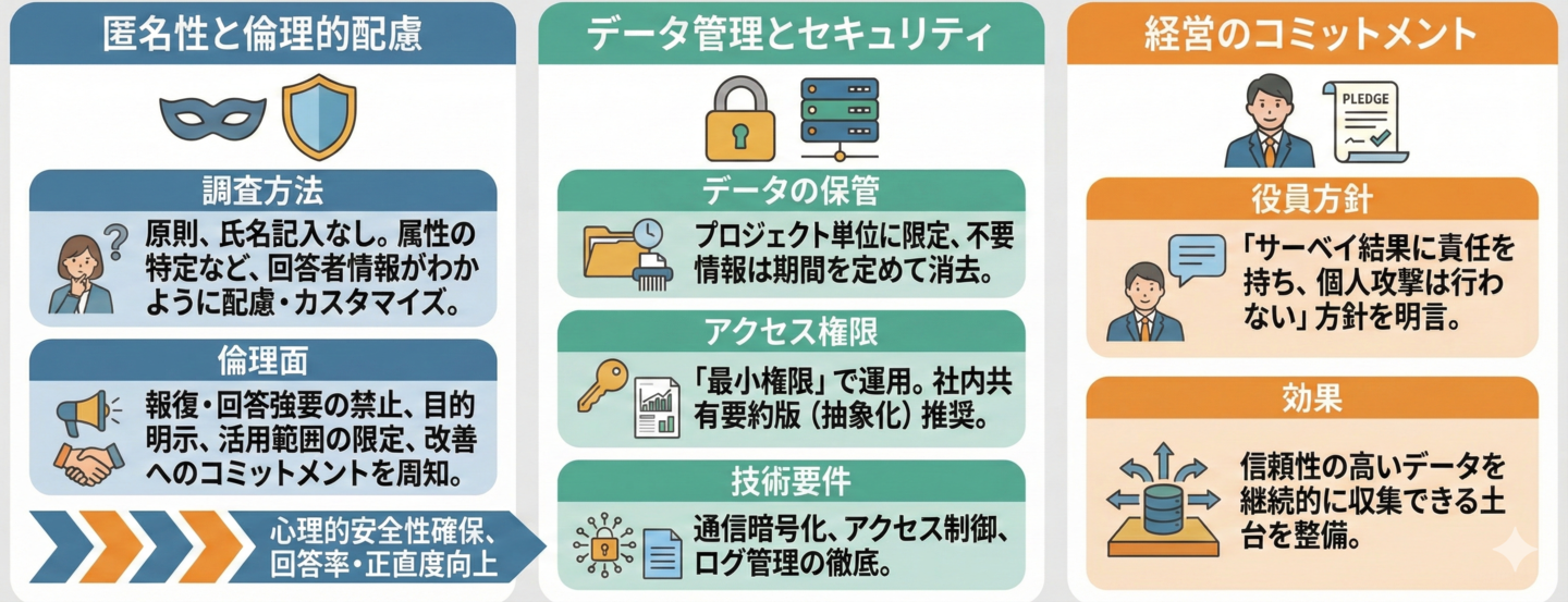 記名調査を避けた匿名性の確保、個人特定の防止、最小権限管理、期間限定のデータ保管など、安全性と倫理性を重視した運用を徹底。