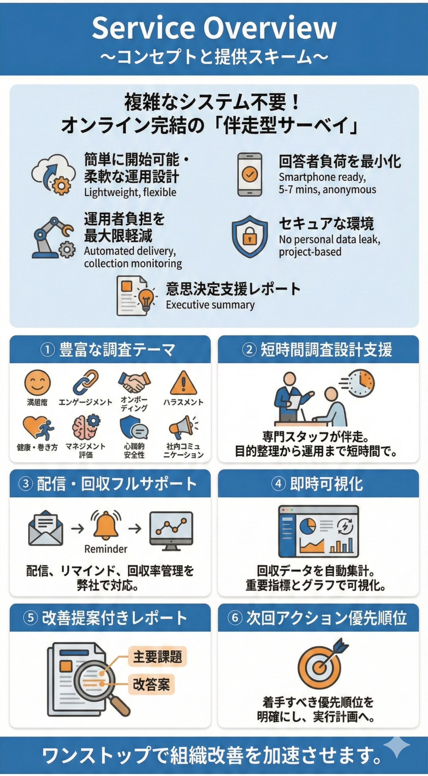 回答者の負担を最小化しつつ、配信・回収・集計までを自動化し、運用者の手間を徹底軽減。改善策とアクションまで一気通貫で提供します。