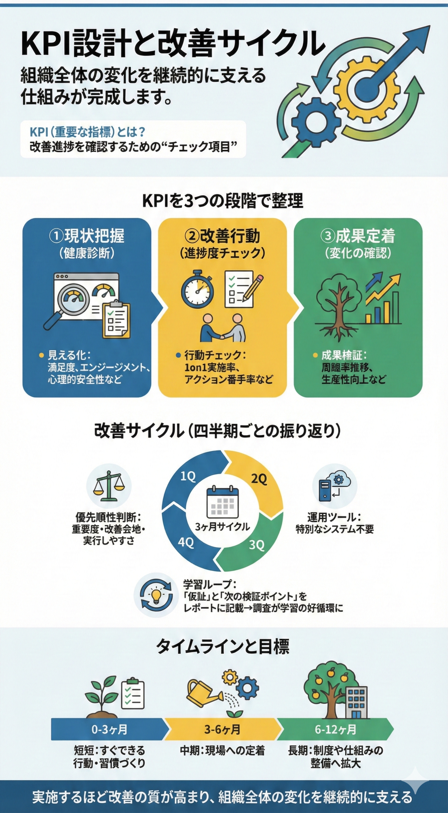 現状の可視化、改善行動の進捗確認、成果の定着検証を3段階で実施し、四半期ごとに学習を重ねる仕組みを構築。
