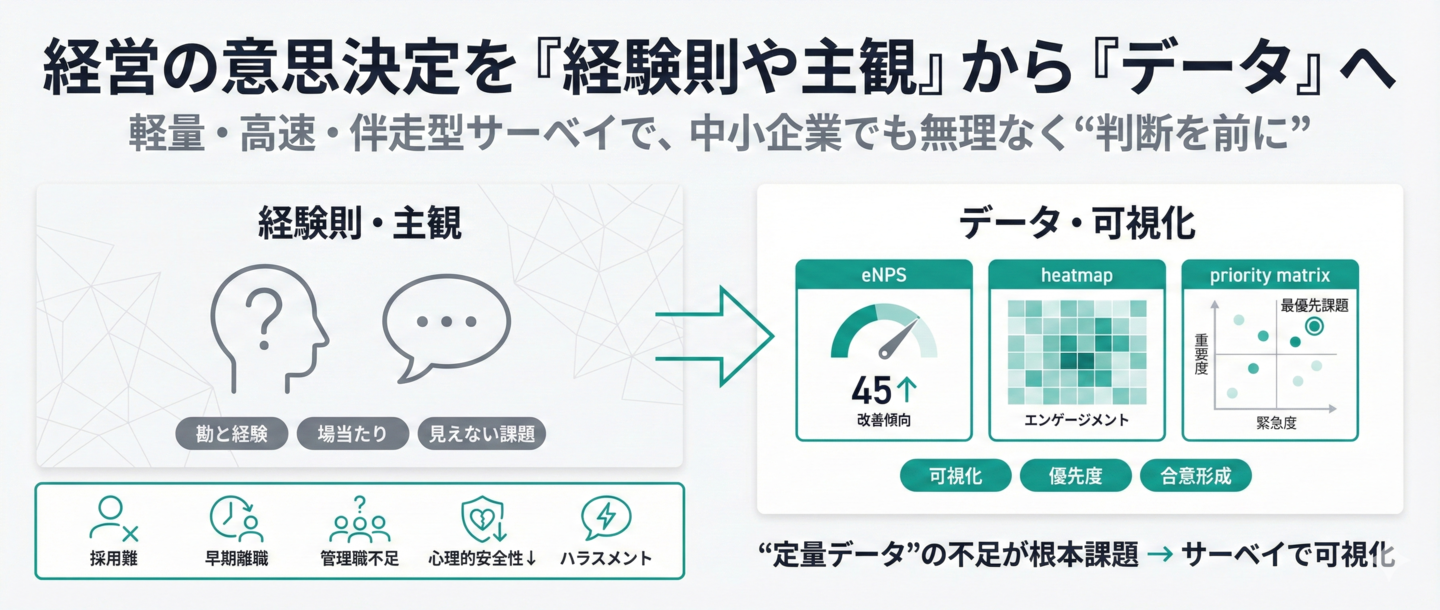 そこで私たちは、中小企業が無理なく使え、経営判断のスピードを上げるための“軽量・高速・伴走型サーベイ”を開発しました。