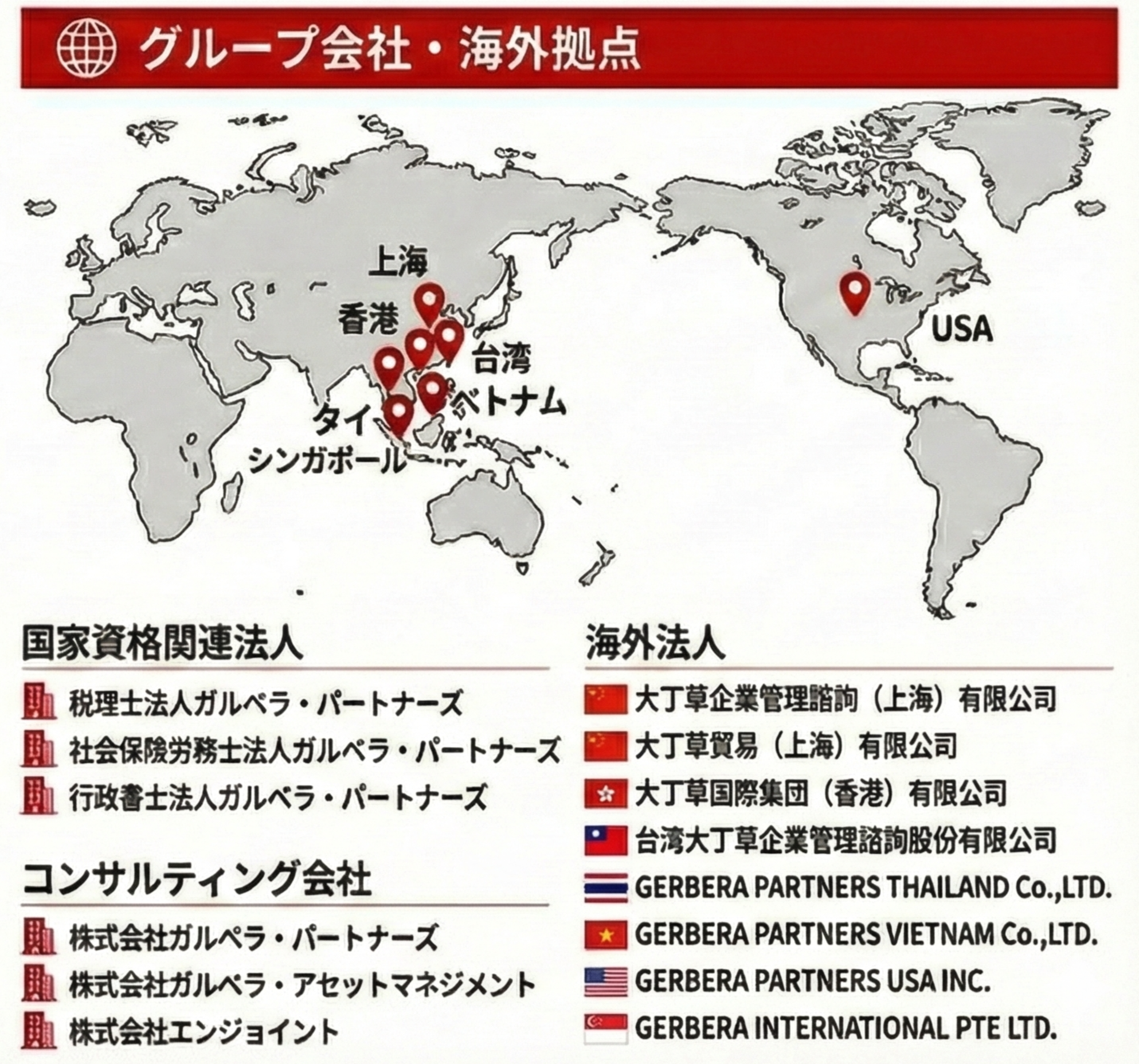 ガルベラグループには、税理士・社労士・行政書士・人事コンサルタント・海外法人など多様な専門家が在籍しています。