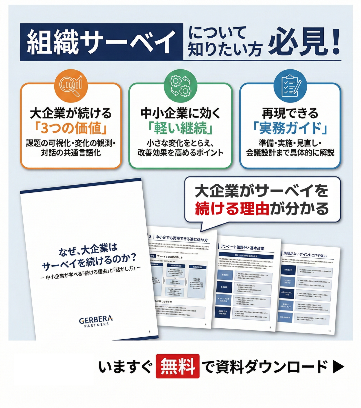 大企業がサーベイを継続する理由を、組織課題の可視化、変化の定点観測、共通言語化、改善行動の定着という4つの効果から体系的に解説。