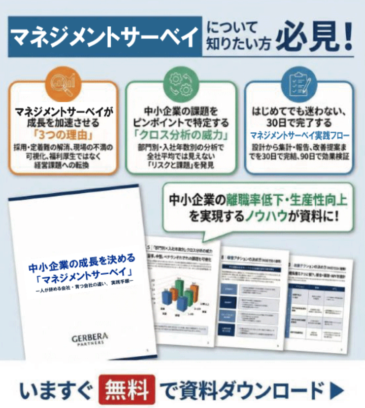 中小企業が従業員サーベイを導入・継続する理由を、組織課題の可視化、離職リスクの早期発見、共通言語化、改善行動の定着という4つの効果から体系的に解説。