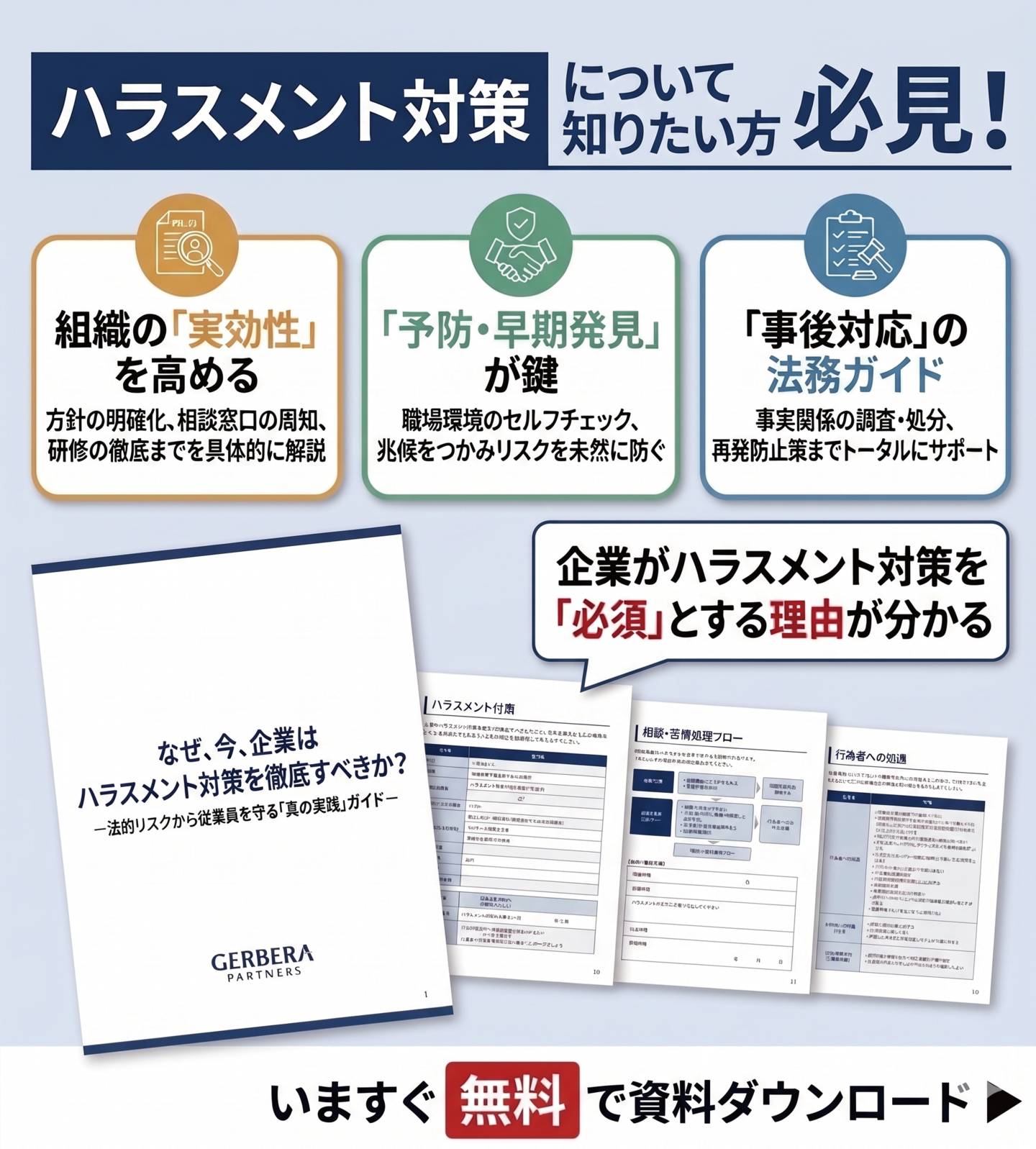本資料では、ハラスメントの定義・判断基準から、企業リスク、予防策、相談対応フロー、再発防止までを体系的に整理。