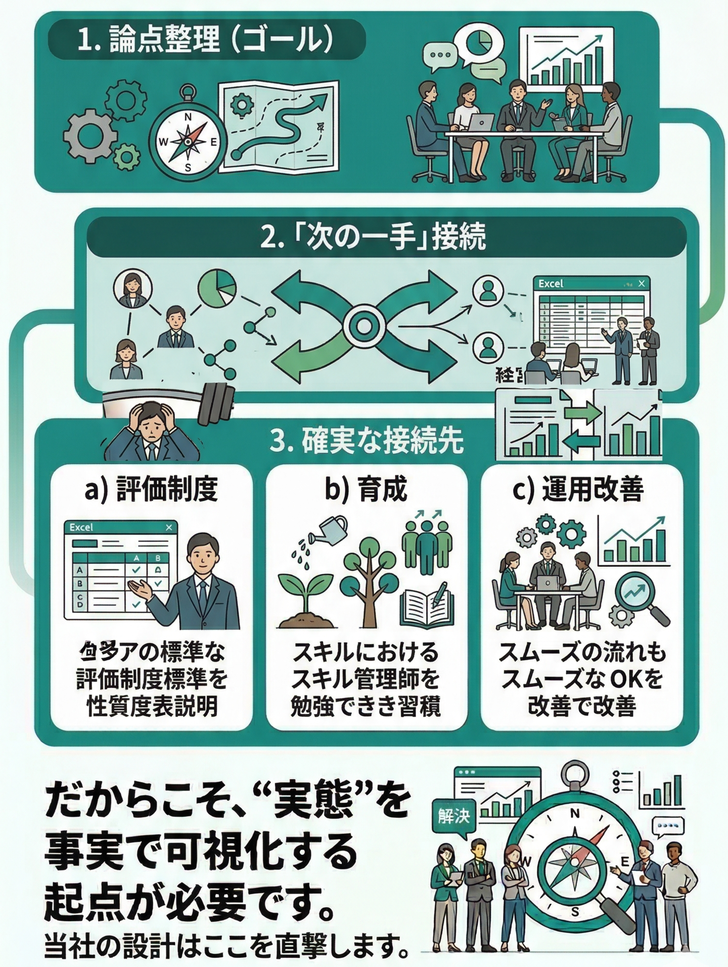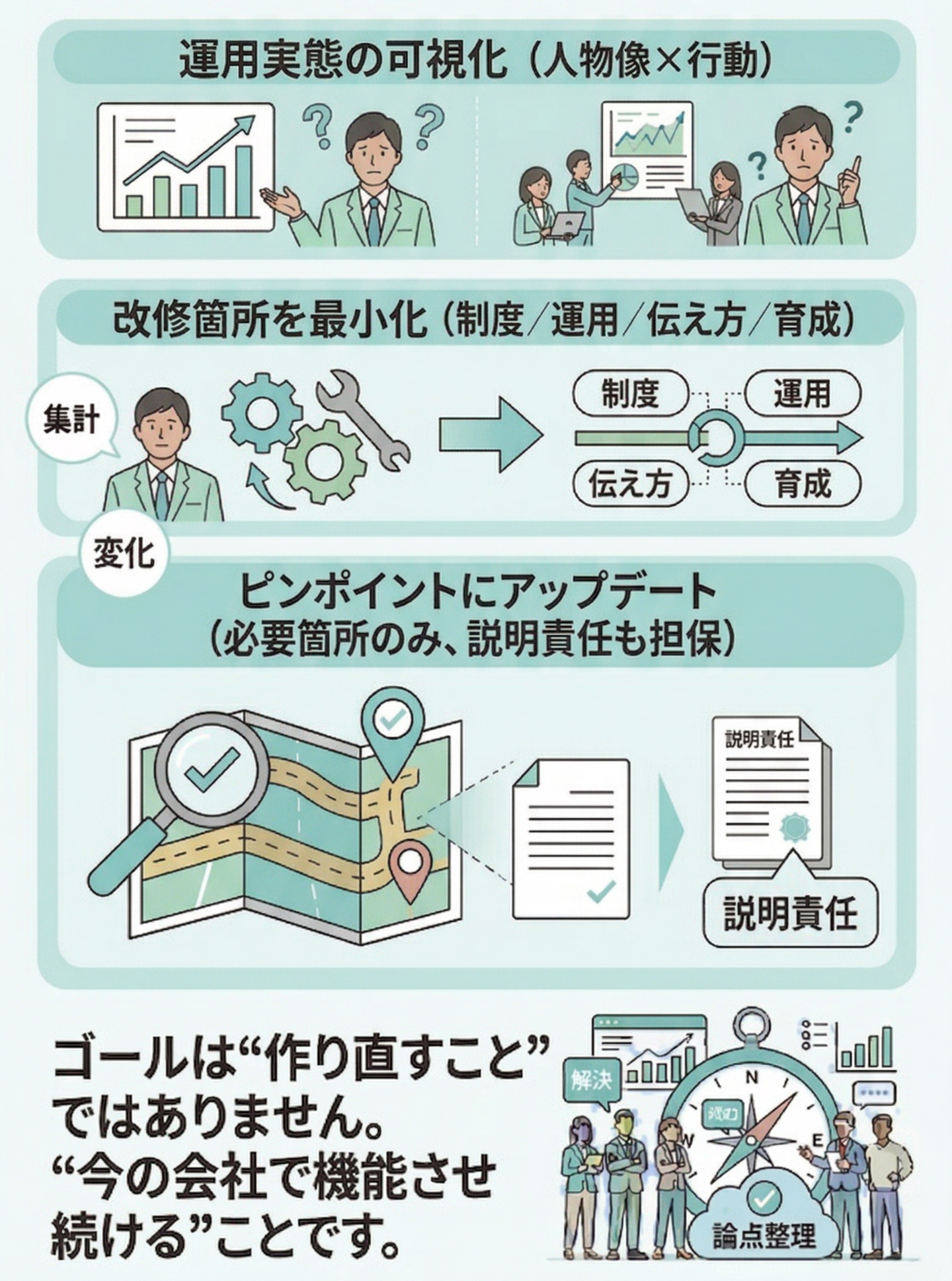 「次の一手」を選ぶための論点整理をゴールに据え、評価制度・育成・運用改善へ確実に接続します。