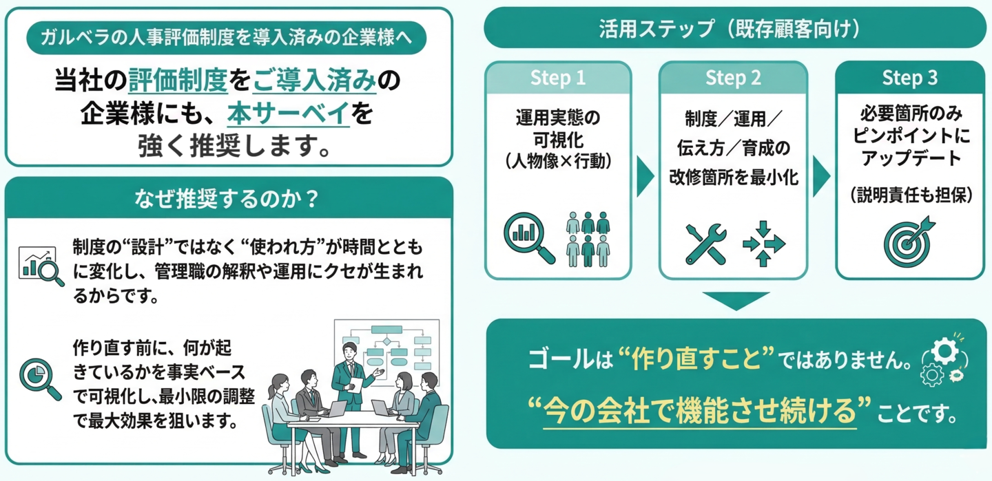 本サーベイは、制度を作り直す前に実態を事実で可視化し、最小限の調整で制度を機能させ続けるための判断材料を提供します。