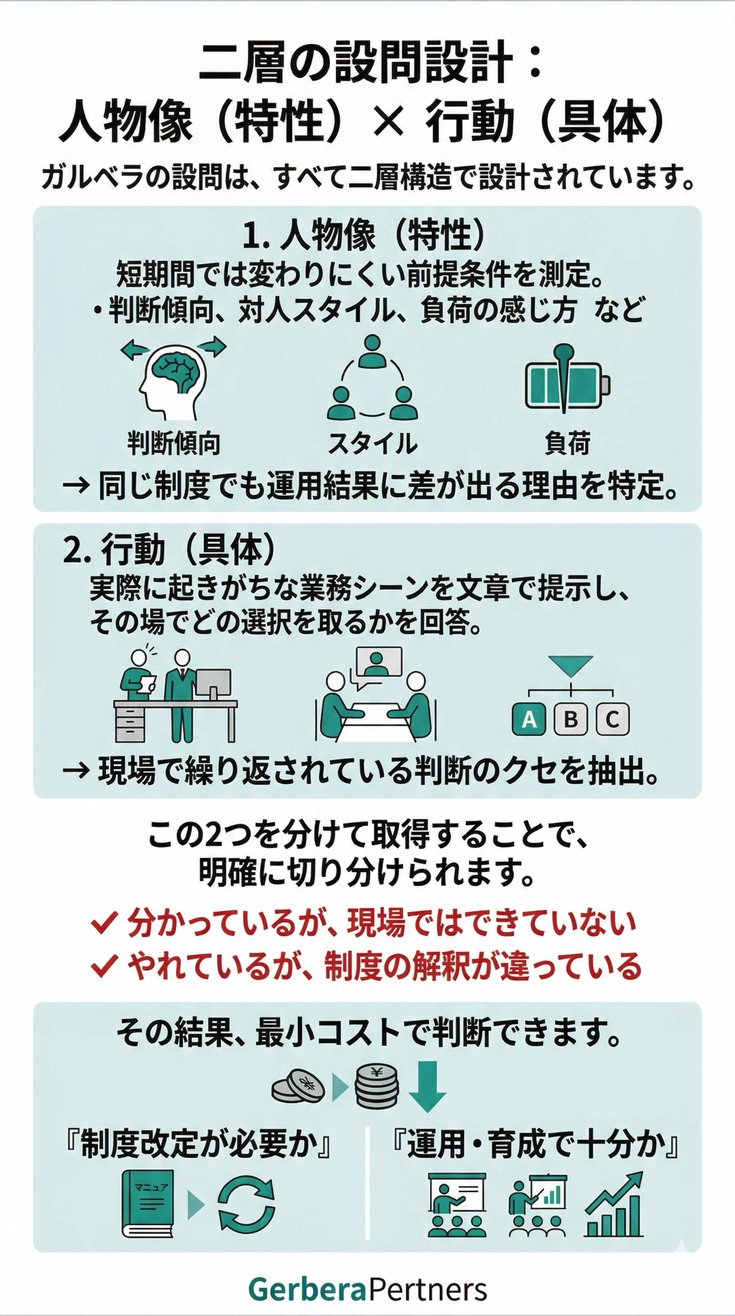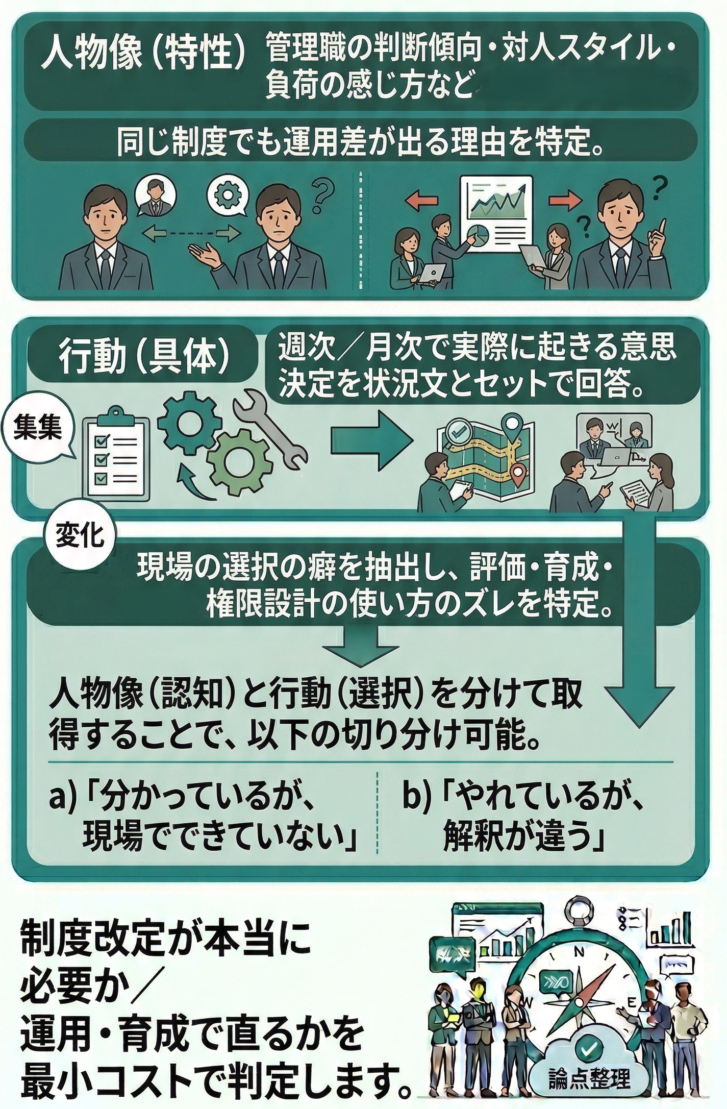 制度理解と現場判断のズレを切り分け、制度改定か運用・育成改善かを最小コストで見極めます。
