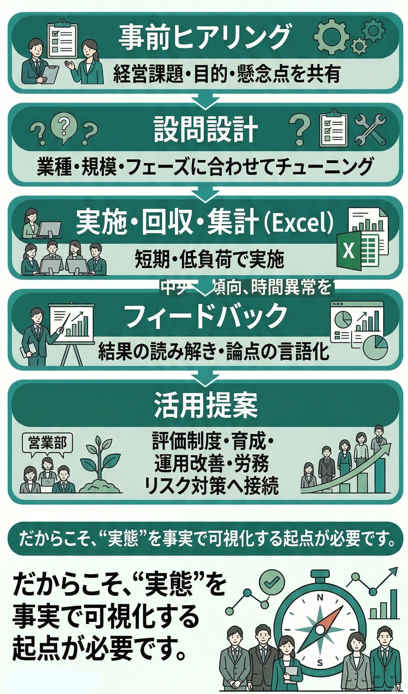 調査で終わらせず、評価制度・育成・運用改善・労務リスク対策へ確実につなげます。