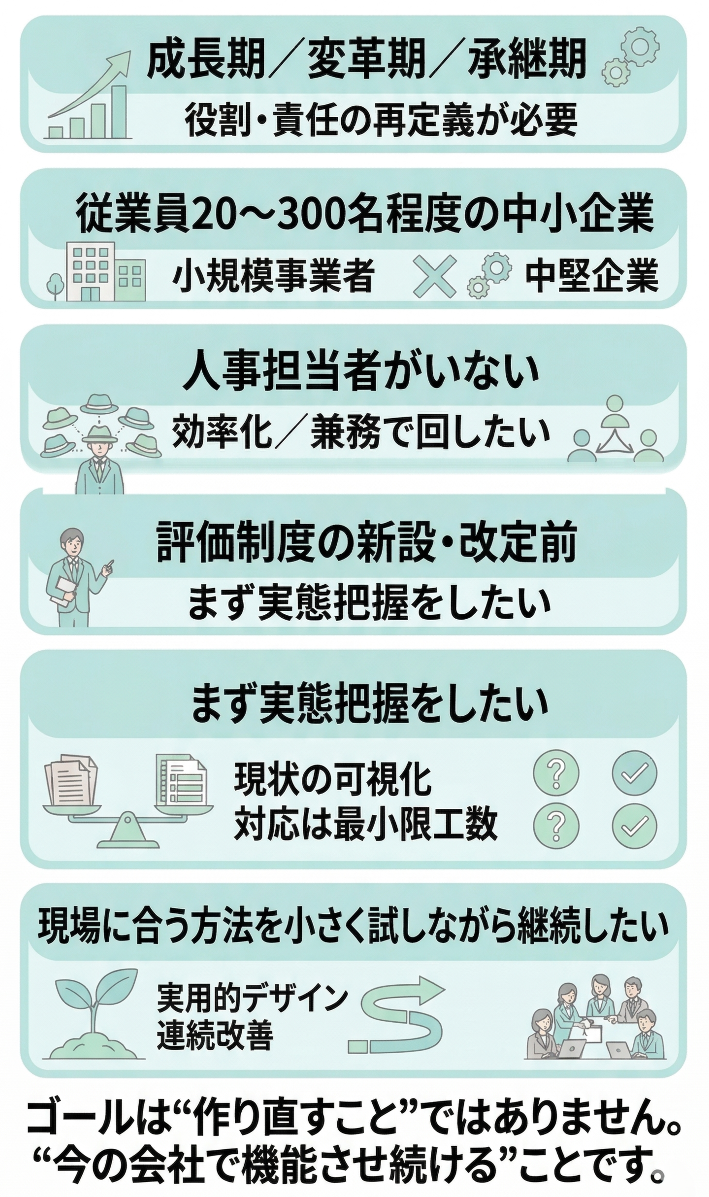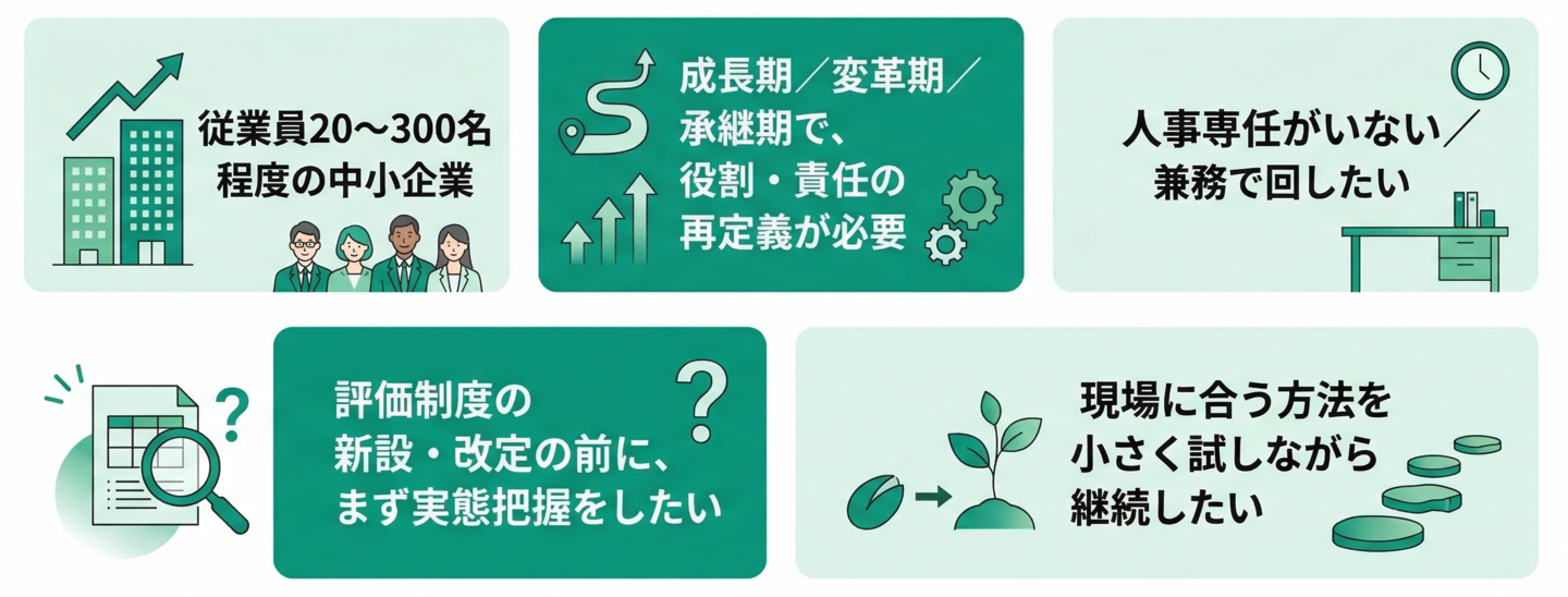 成長・変革・承継期に役割や責任の再定義が必要で、評価制度の新設・改定前に実態を把握し、現場に合う方法を小さく試しながら改善したい企業に適しています。
