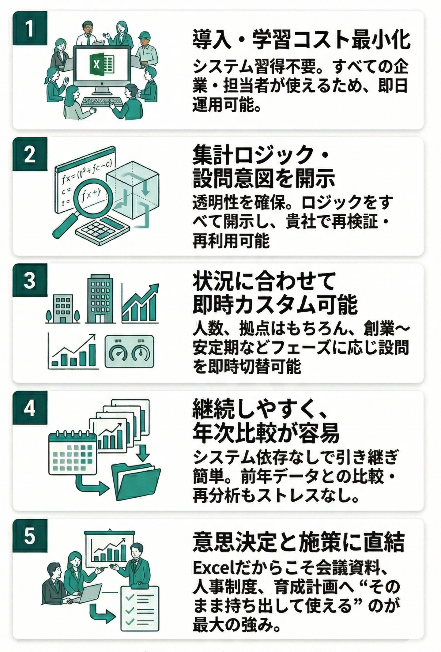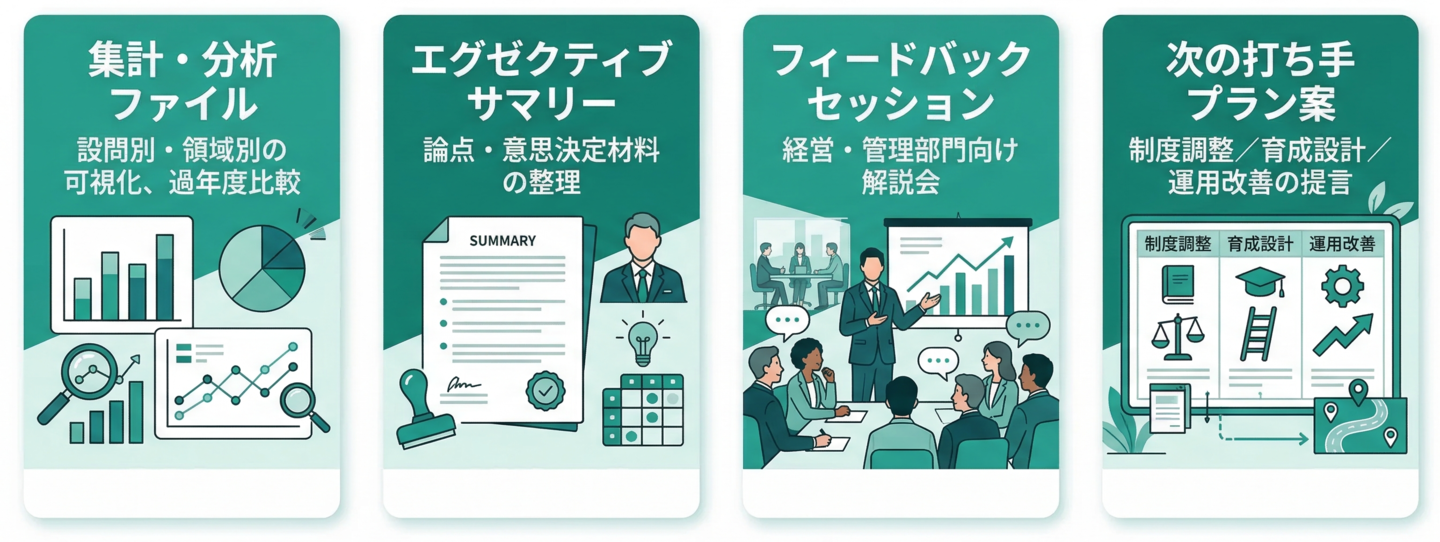 集計・分析Excel、エグゼクティブサマリー、フィードバックセッションまで一式で提供。