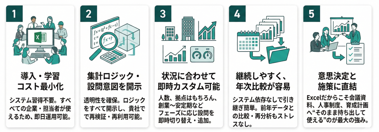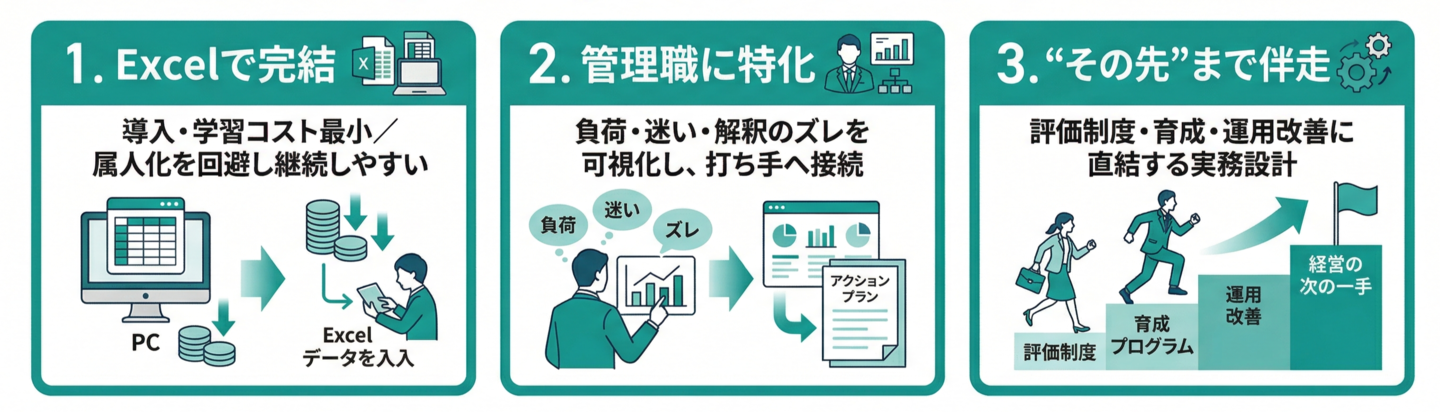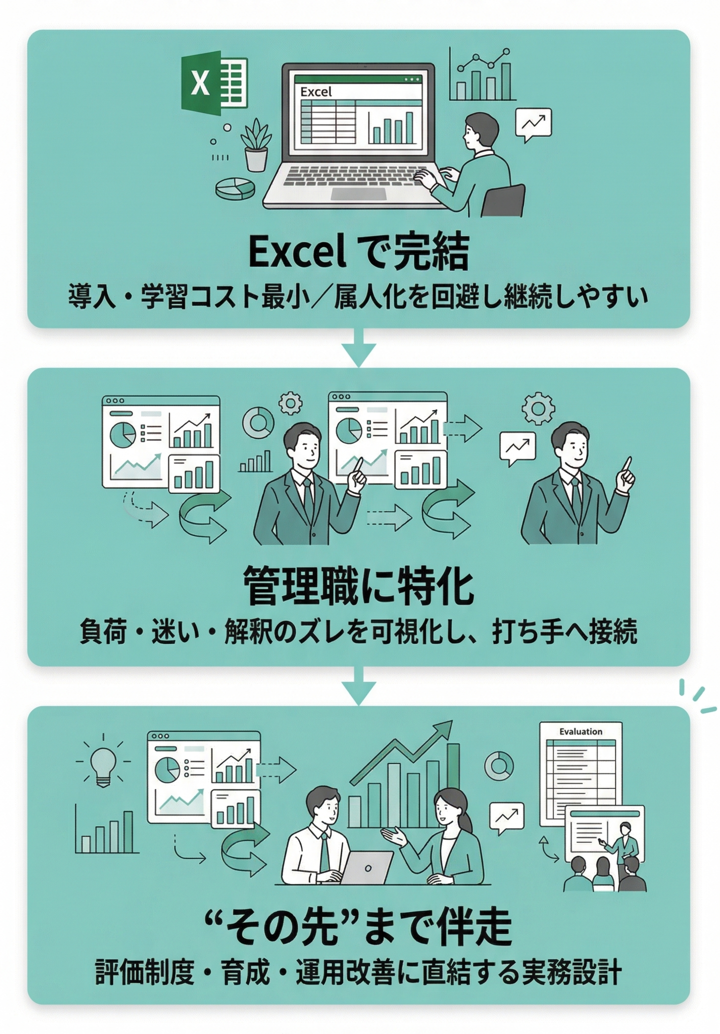 大掛かりなシステムは使いません。 Excelで、今のマネジメントを“見える化”。 評価制度・育成・運用改善に確実につなげます。