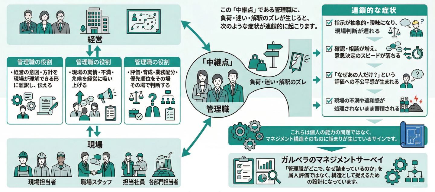 経営の意図を現場へ伝え、現場の声を経営へ上げ、評価・育成・調整を担う管理職。