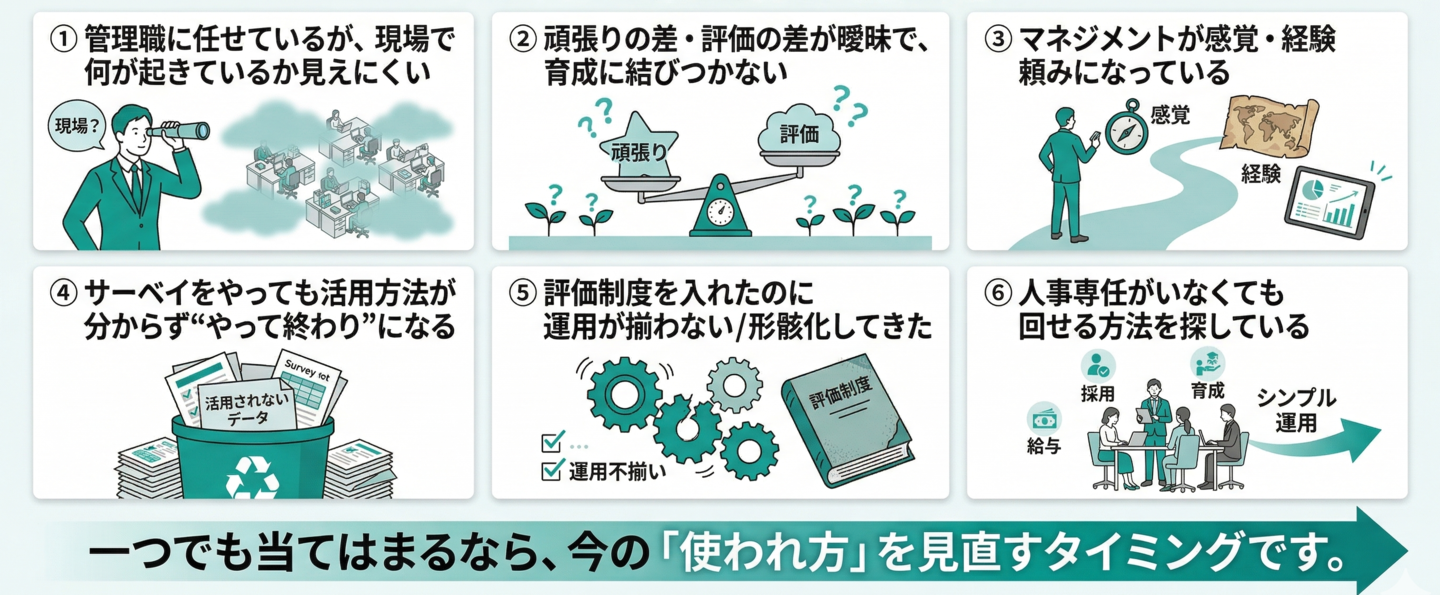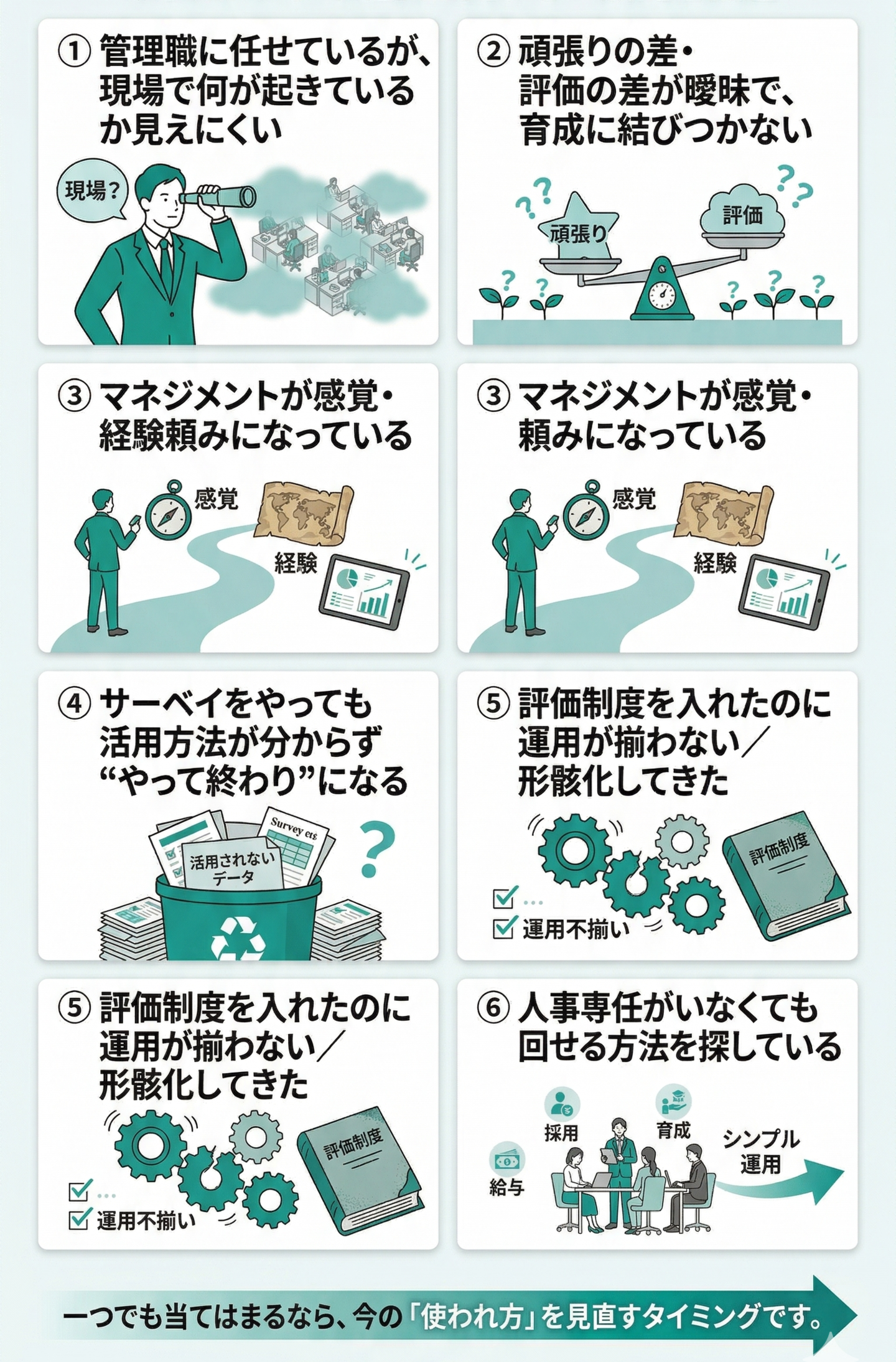 採用や制度を見直しても改善しない場合、多くは現場マネジメントに原因があります。サーベイは、その見えない要因を可視化する最短ルートです。