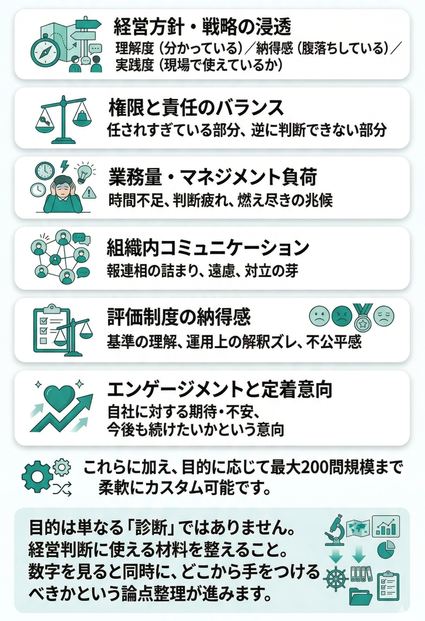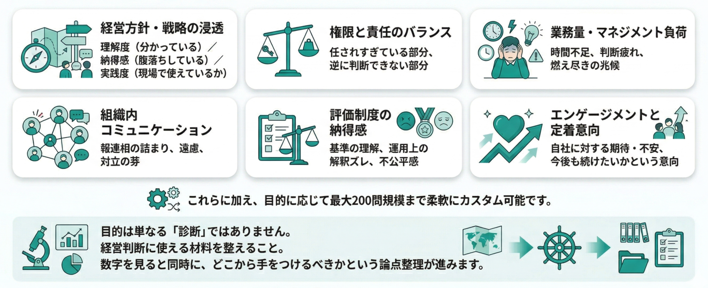 経営方針の理解度、評価の解釈ズレ、管理職の負荷や関係性の詰まりまでを事実で把握。
