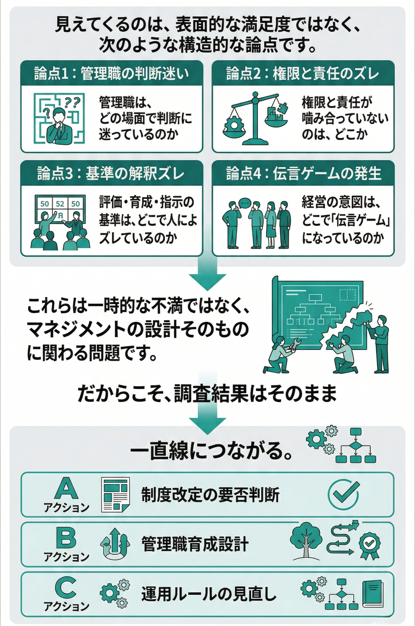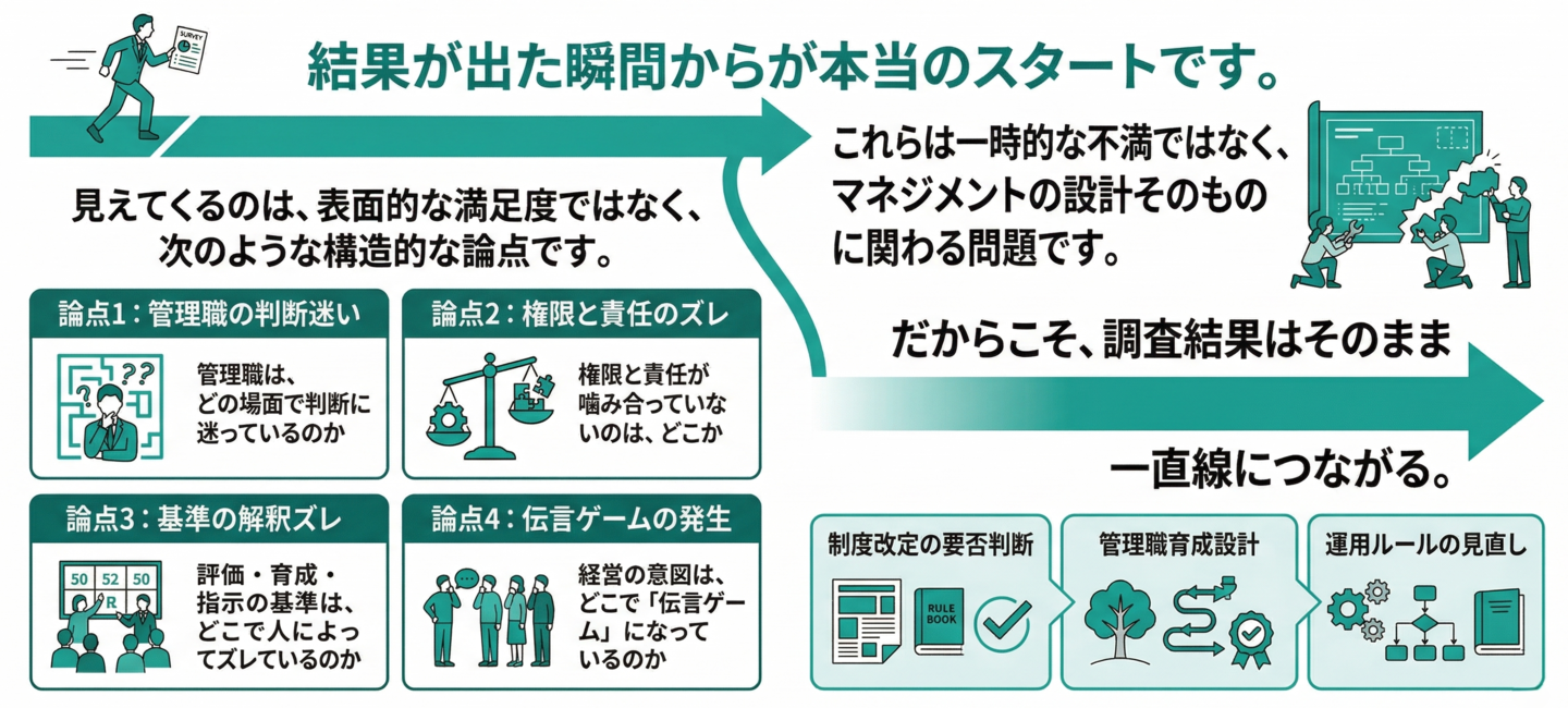 結果を「読む」だけで終わらせず、論点整理から次の打ち手(制度・育成・運用改善)までを具体的に描きます。