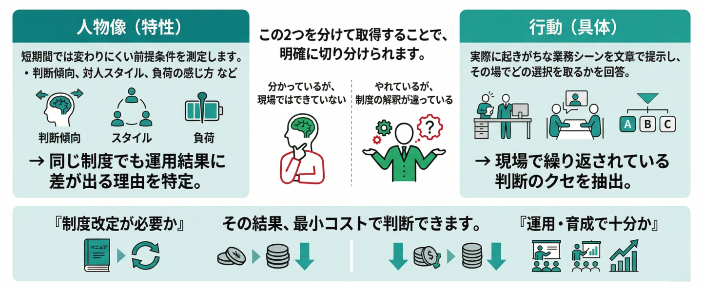 人物像(判断傾向・負荷感)と行動(具体的選択)を分けて測定。