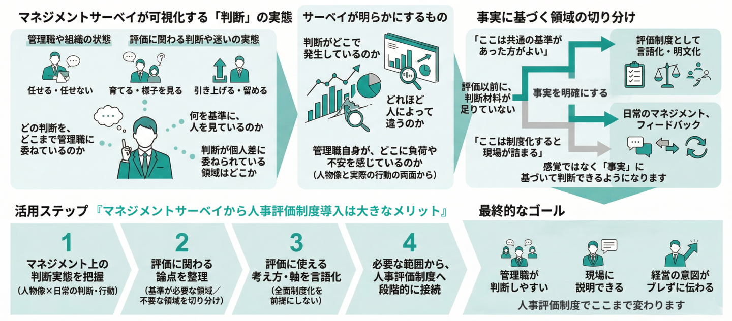 管理職の迷い、権限と責任のズレ、評価や育成のばらつき、経営意図の伝言ゲーム化を構造として捉え、制度・育成・運用の次の一手へ確実につなげます。