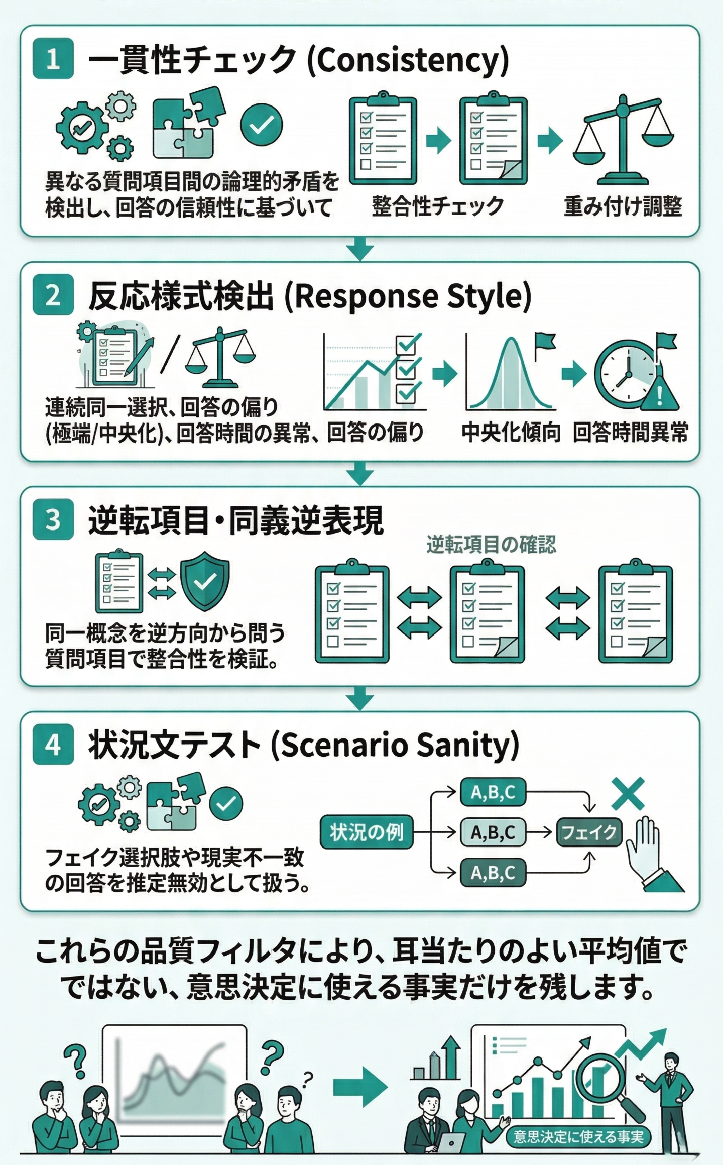 一貫性・反応様式・逆転項目・状況文テストで虚偽や体裁回答を除去。