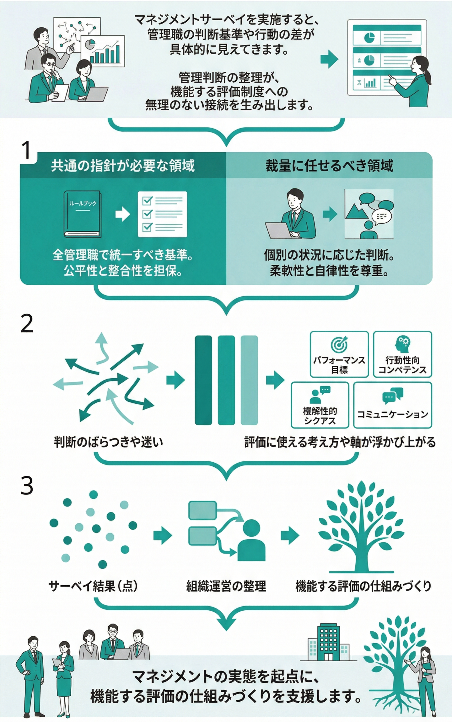 マネジメントサーベイを実施すると、管理職の判断基準や行動の差が具体的に見えてきます。