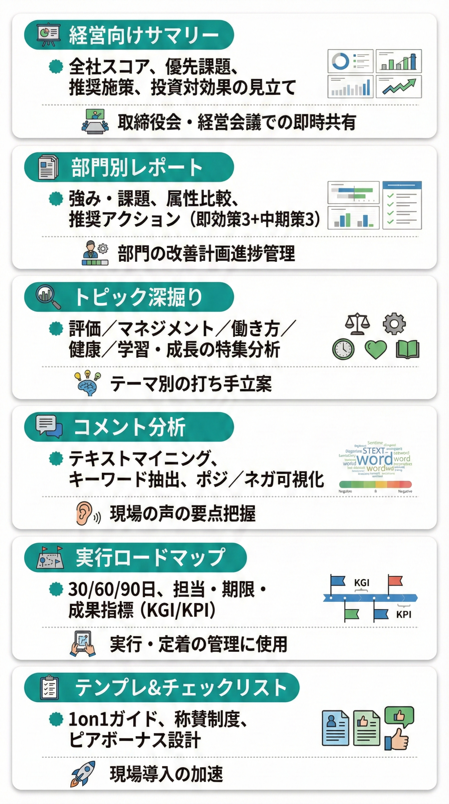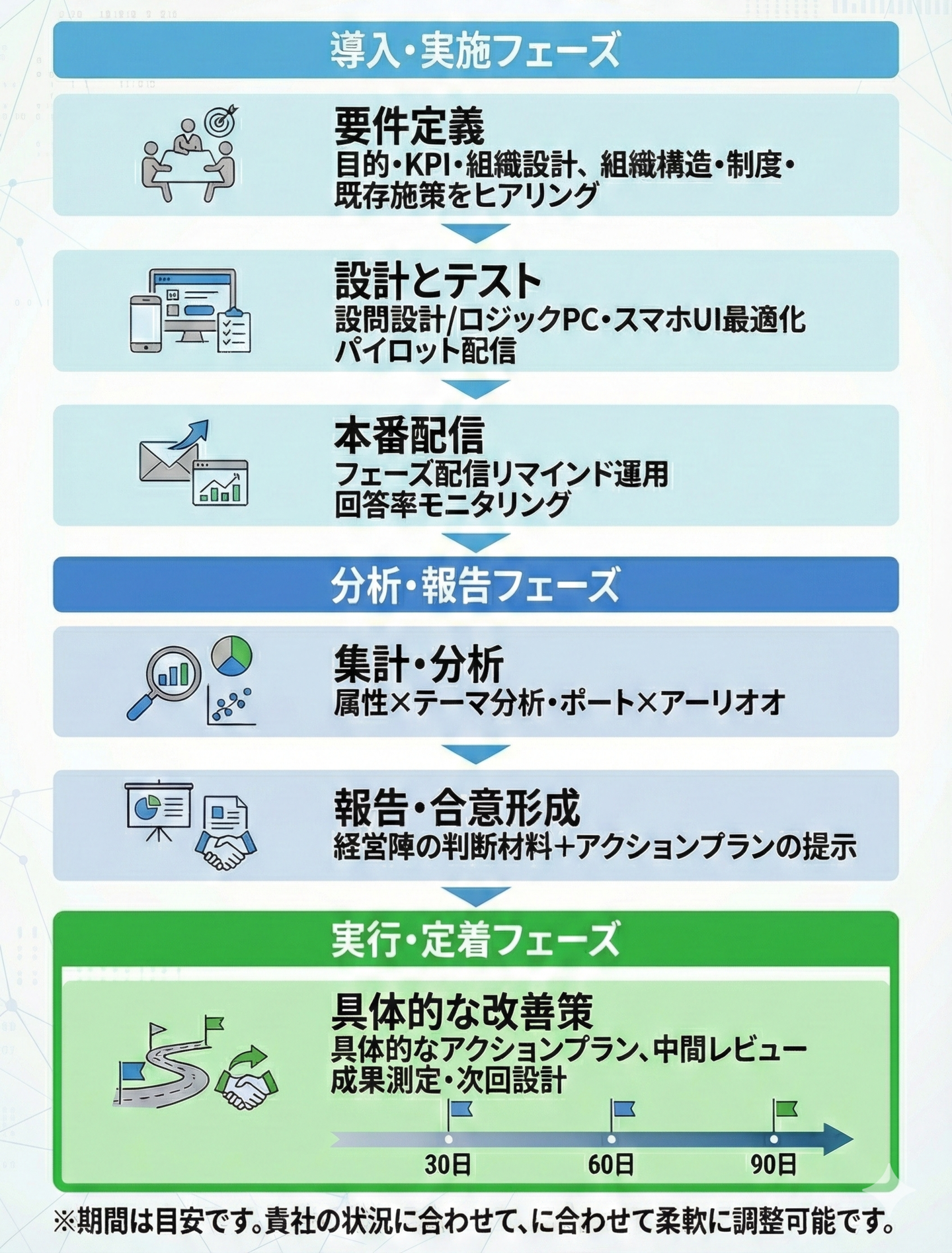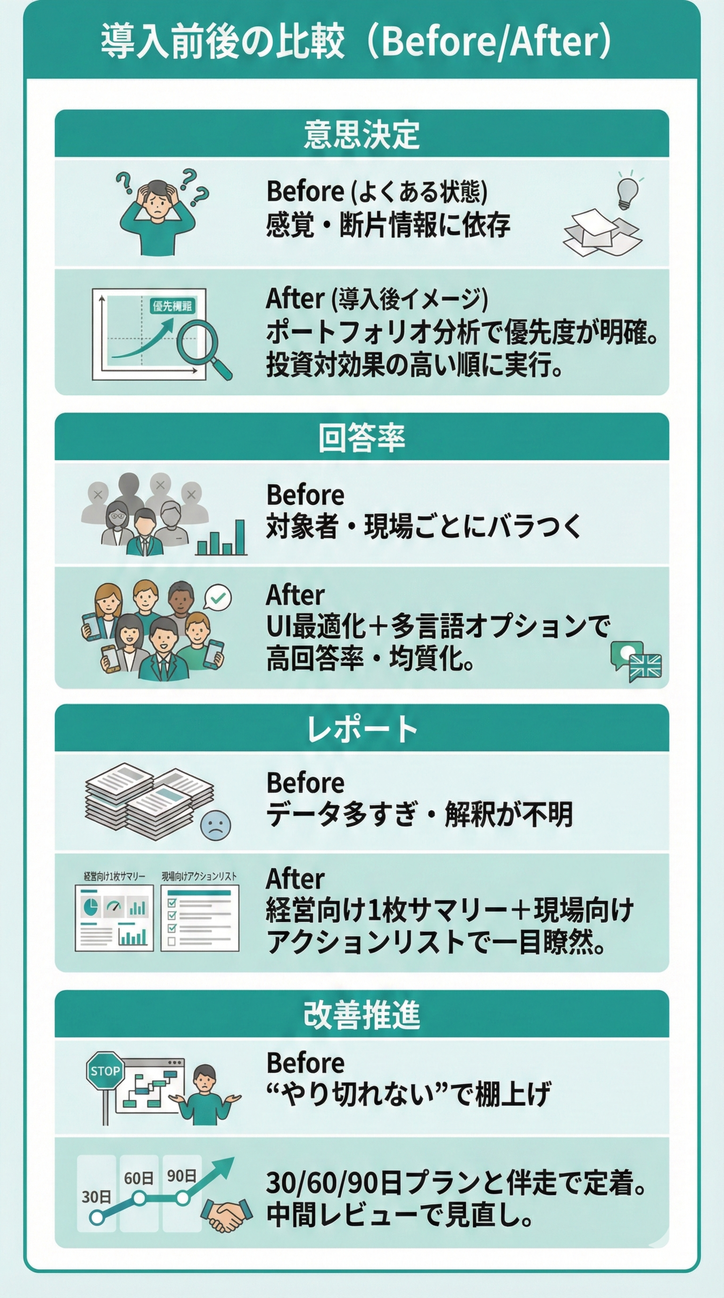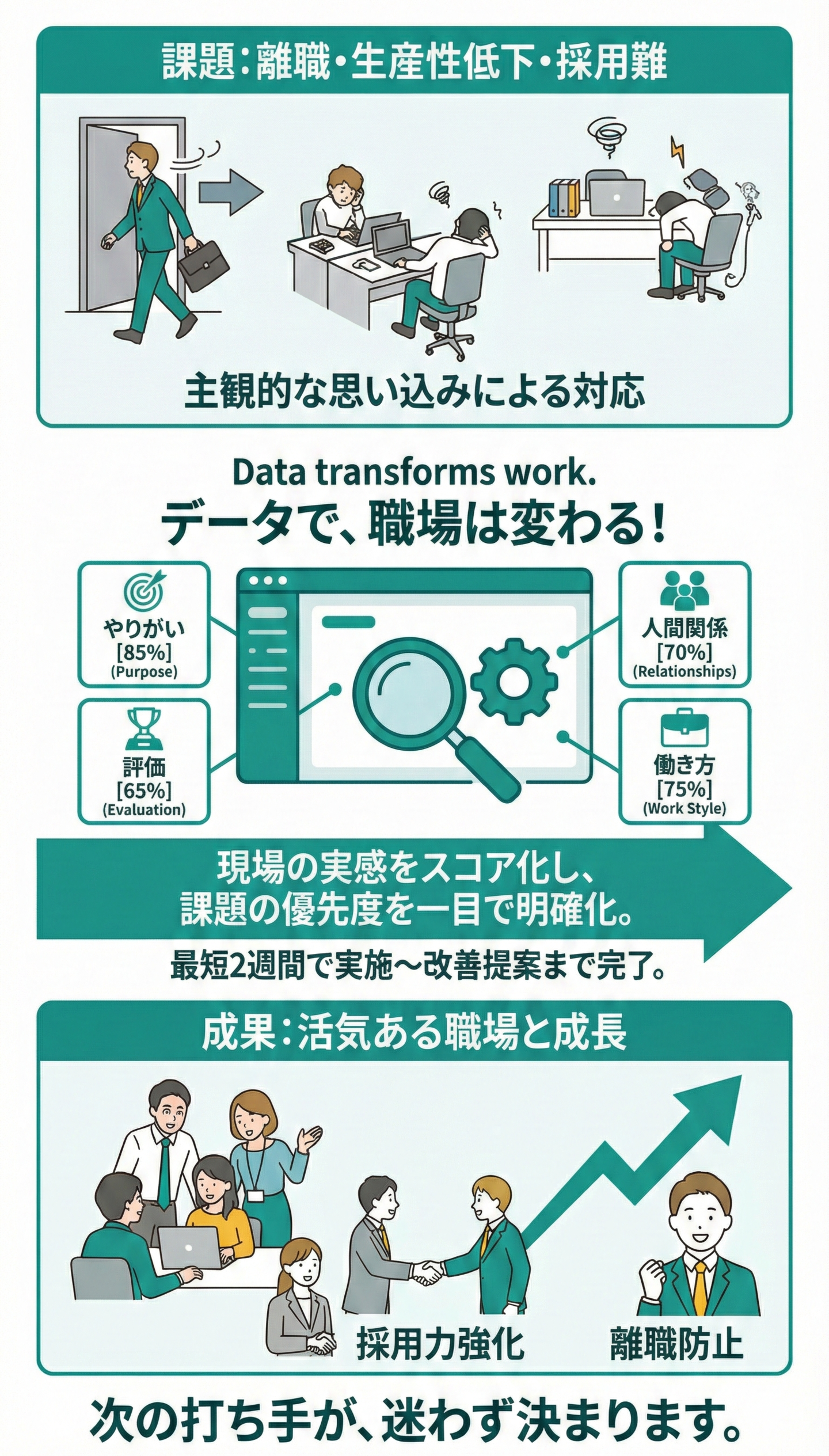 組織課題の「見える化」から「改善の定着」まで。