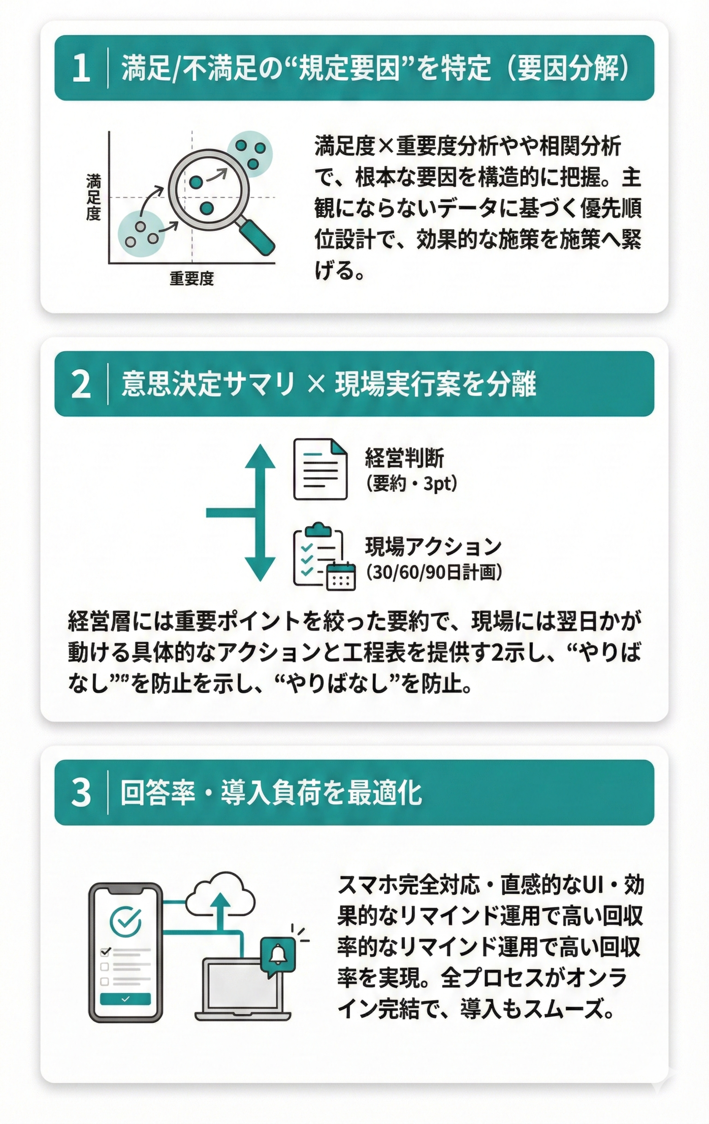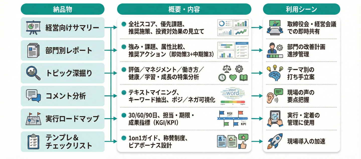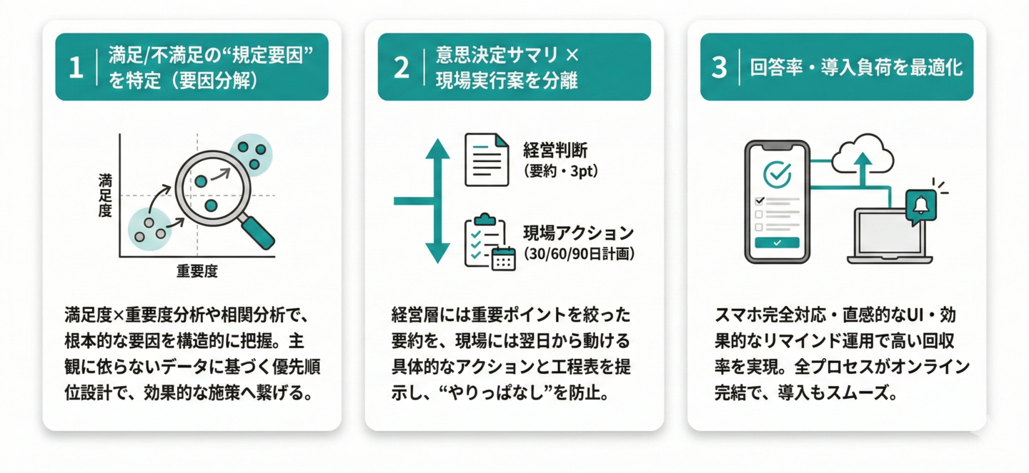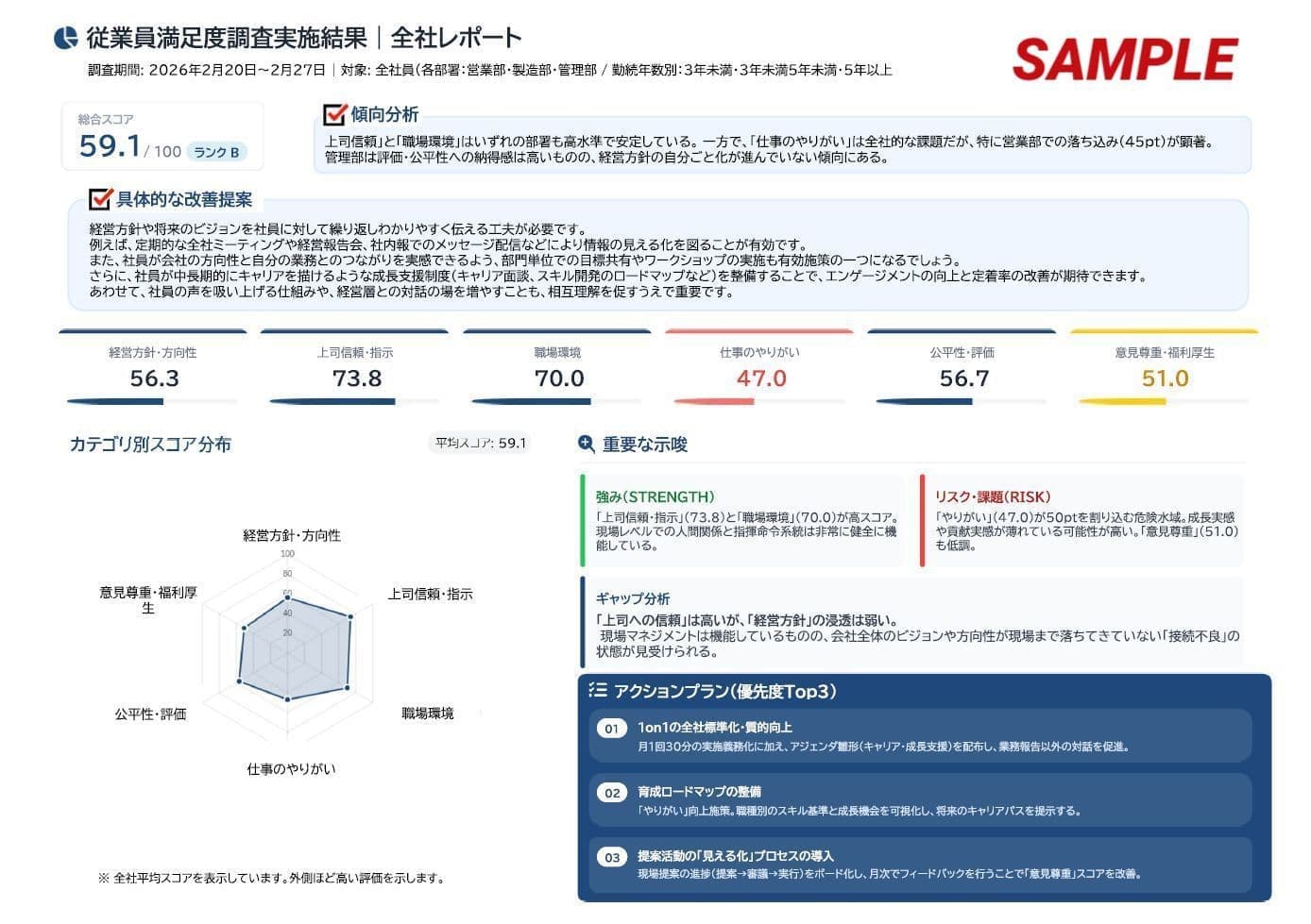従業員満足度の現状を可視化し、課題と改善策を明確に提示することを目的としています。