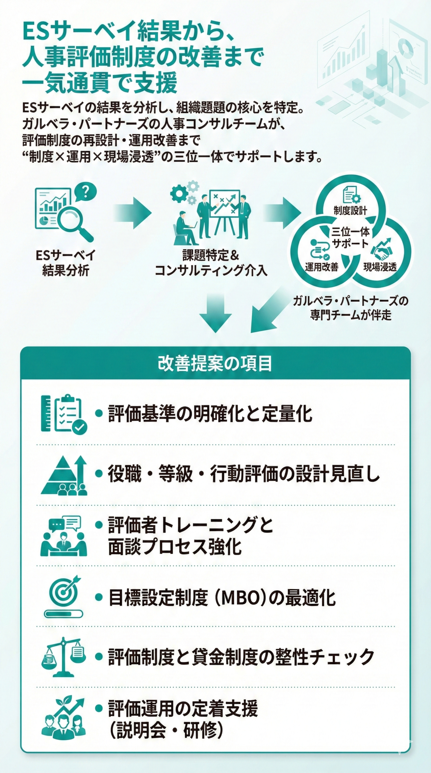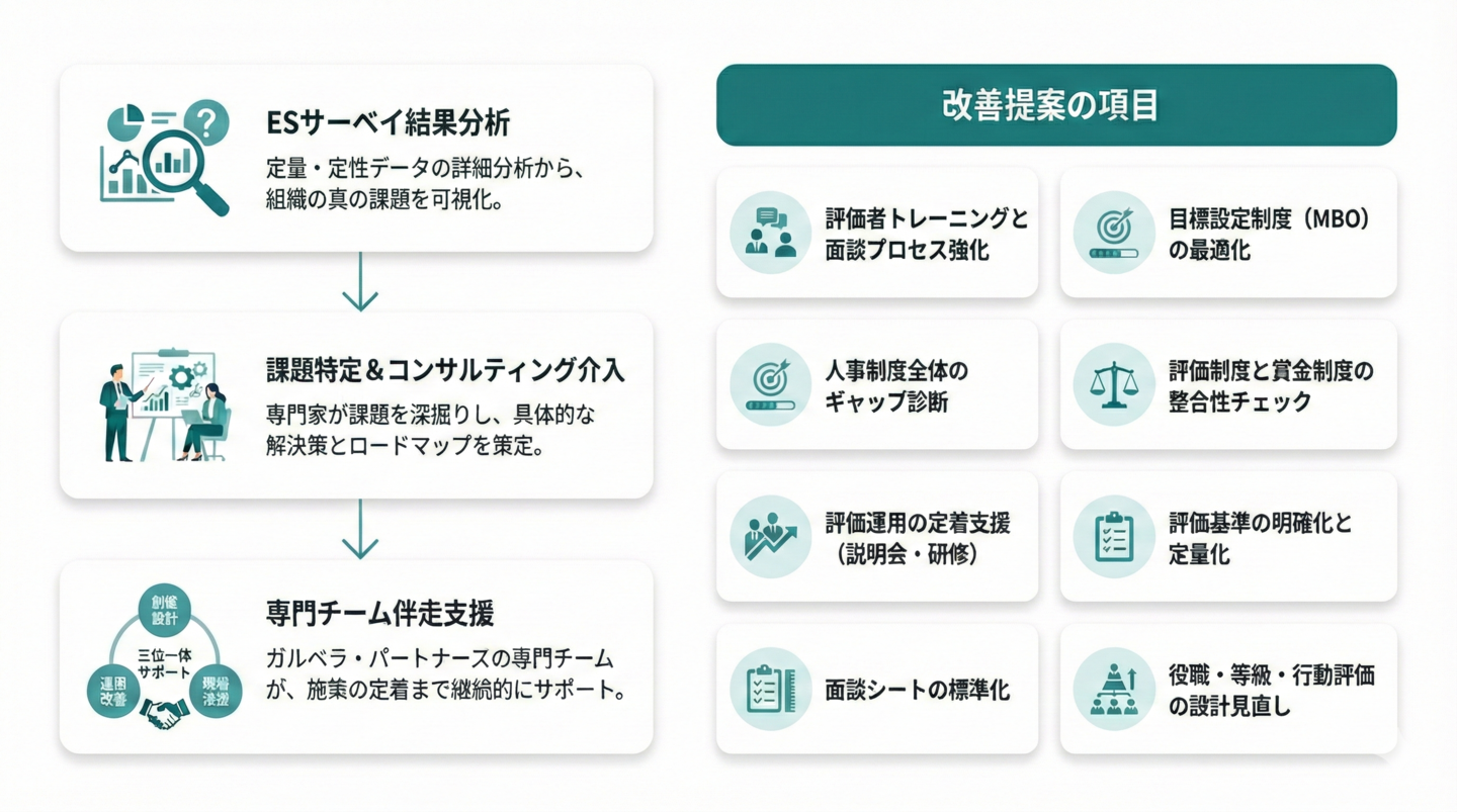 POINT 2. ESサーベイは、人事評価制度の“入口”です。 ガルベラなら、追加で設計・実装も可能!