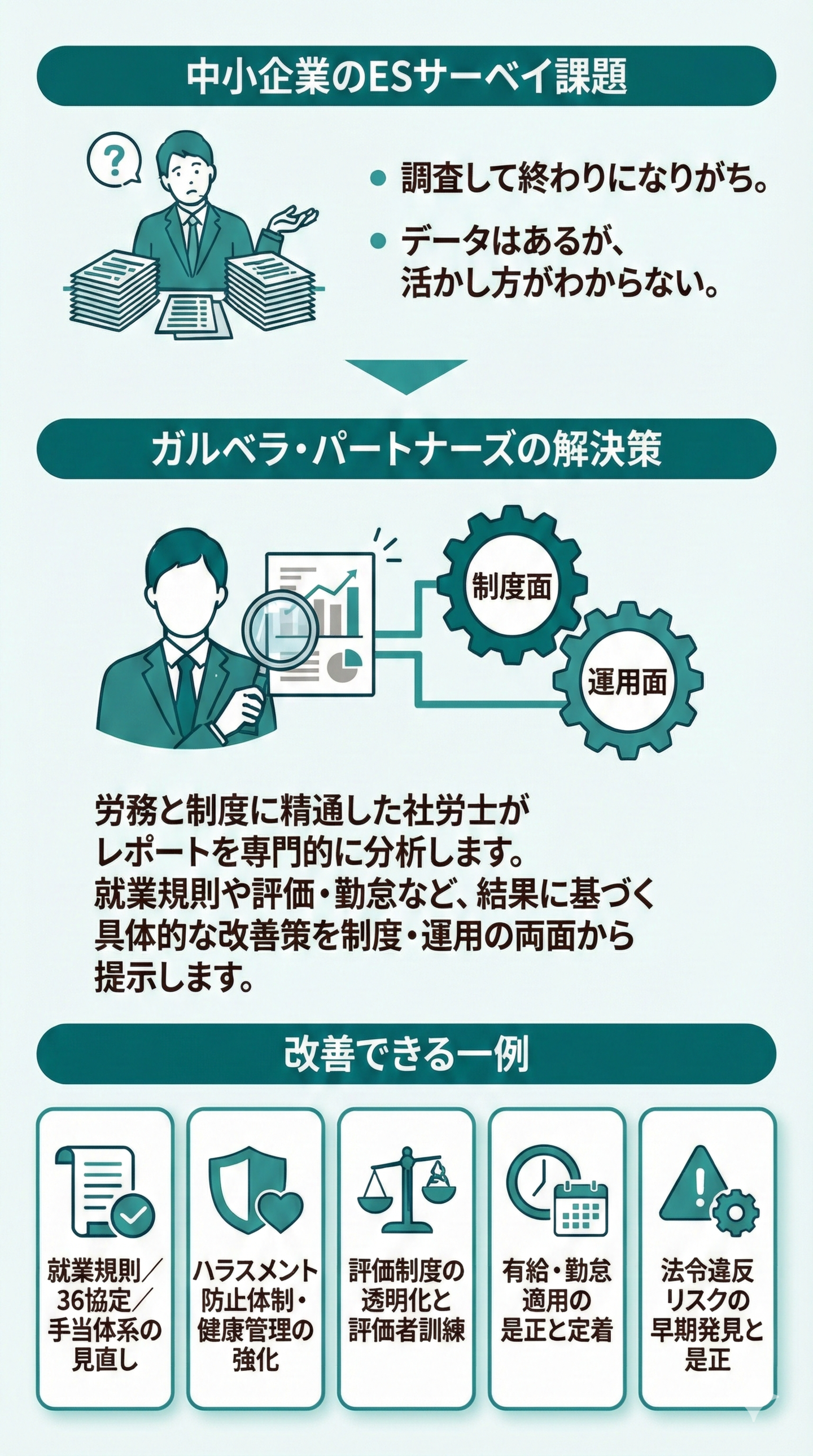 POINT 1. 社労士が結果を解釈し、労務・規程・運用の改善を提示します。