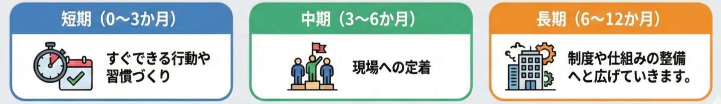 Excel中心の軽い運用で継続性を担保し、短期の行動変化から中長期の制度定着まで一貫して支援します。