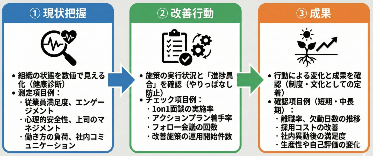 サーベイを実施して終わりにせず、現場の改善行動につなげるため、KPIを「現状把握」「改善行動」「成果定着」の3つの段階に分けて整理しています。