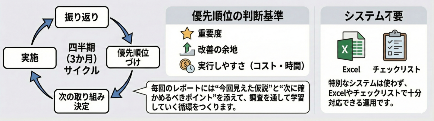 現状の可視化、改善行動の進捗確認、成果の定着検証を3段階で実施し、四半期ごとに学習を重ねる仕組みを構築。