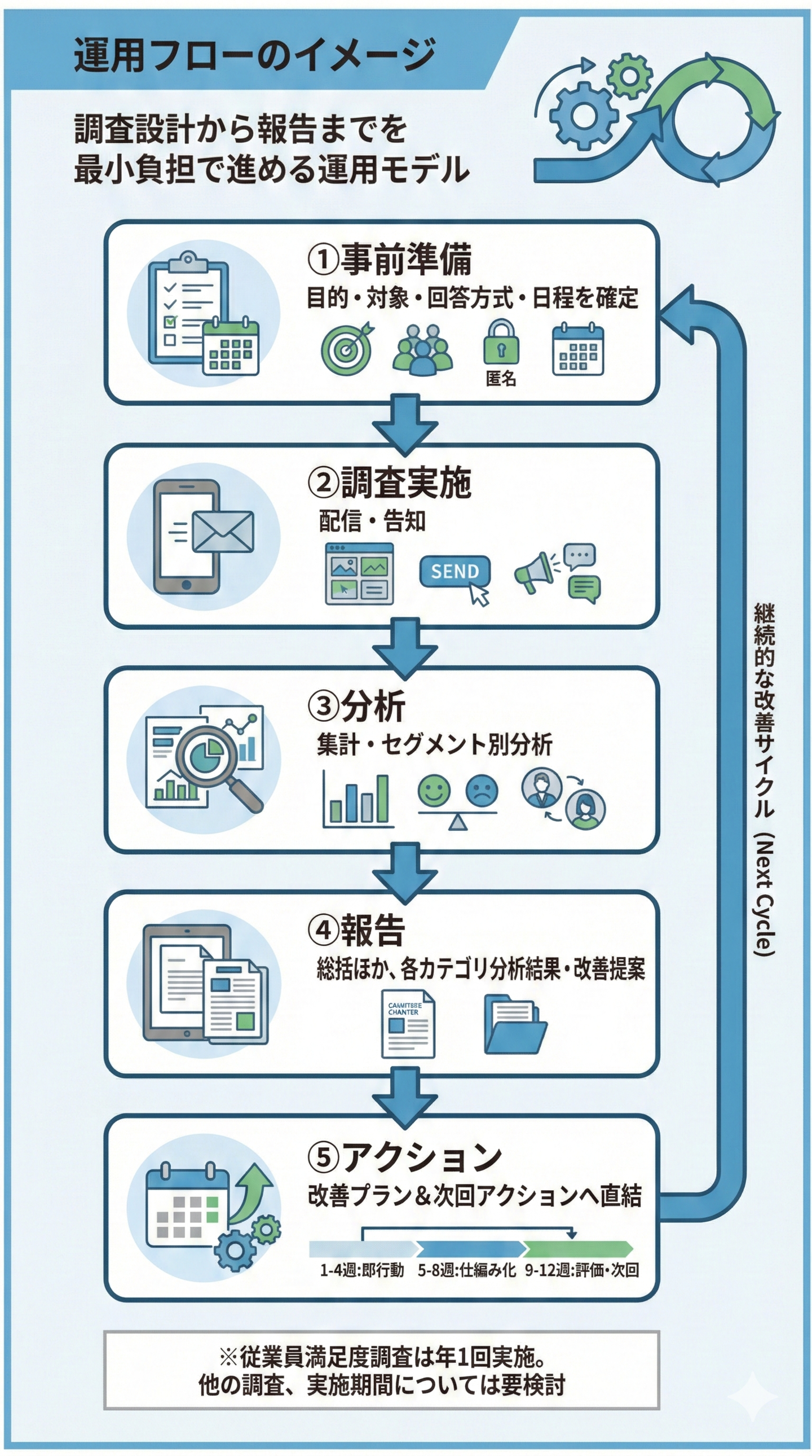 運用は「事前準備→調査実施→分析→報告→アクション」の5ステップに整理します。