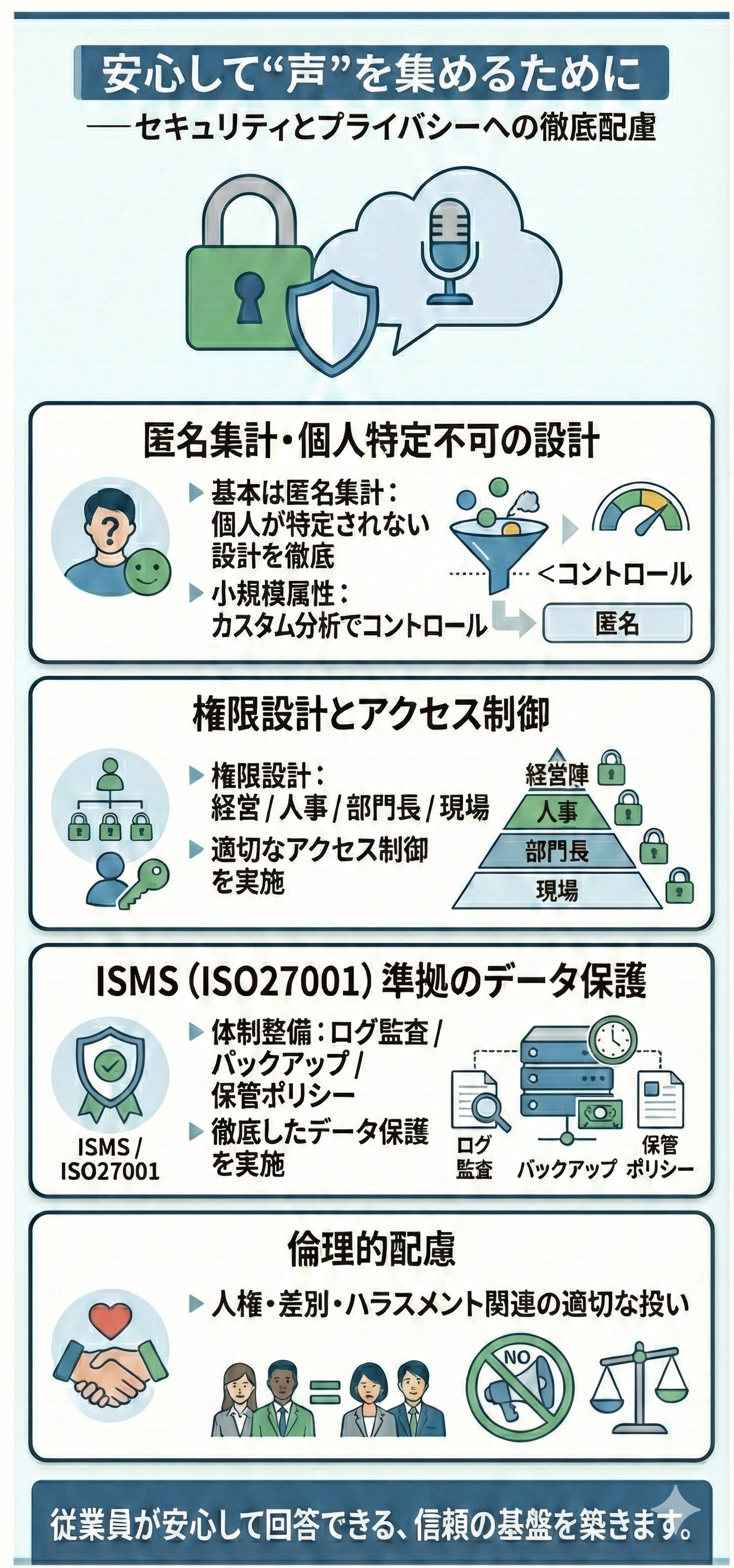 記名調査を避けた匿名性の確保、個人特定の防止、最小権限管理、期間限定のデータ保管など、安全性と倫理性を重視した運用を徹底。